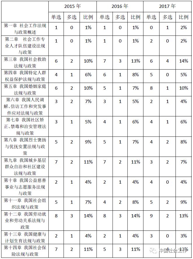 根据《考纲》,2018 年《社会工作法规与政策》的考点多达168 个。根据笔者多年来的培训经验及对历年真题的解读,考生要通过本科目考试,需要在熟悉教材全貌的基础上,重点关注历年来出题较多的章节和内容。为方便大家了解各章节的重要程度,笔者就近三年各章节在考试中所占的比重进行了归纳统计。